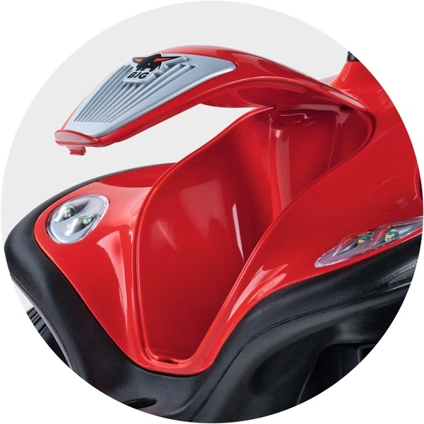 | Inhalt/Ausstattung | Berührungssensor zum Ein- und Ausschalten im Armaturenbrett, LED-Doppelscheinwerfer, elektronische Hupe und Anlasser, abnehm- und abwaschbarer Soft-Sitz, Staufach unter der Motorhaube, Flüsterräder, Anhängerkupplung, Abschaltautomatik nach 10 Minuten | ||