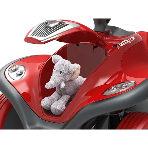 Aus der Verbindung von langjährigem Know-how und der Leidenschaft für hochwertiges Spielzeug entstand ein exklusives Kinderauto, das hohen Fahrkomfort mit modernster Technik verbindet. Das BIG-Bobby-Car NEXT erfüllt die Anforderungen des Rennnachwuchses ab 12 Monaten und verfügt serienmäßig über Doppelscheinwerfer mit LED-Lichtsignatur, einen weichen Schaumsitz und eine elektronische Hupe. Schon optisch überzeugt der hochwertige Rutscher durch seine moderne Farbgebung in Anthrazit und Rot und unterschiedliche, haptische Oberflächen. Die Stromlinienform des BIG-New-Bobby-Car wurde ebenso beibehalten, wie die bewährte Kniemulde, die auch älteren Kindern bequemes Fahren ermöglicht. Besonderes Highlight sind die detaillierten Doppelscheinwerfer mit moderner LED-Technik. Damit das Licht aktiviert werden kann, befindet sich im Armaturenbrett ein Berührungssensor zum Ein- und Ausschalten. Sollten die kleinen Fahrer vergessen, das Licht nach Fahrtende zu löschen, schaltet sich dieses automatisch nach 10 Minuten ab. Alle elektronischen Module wurden in spritzwasserfeste Kunststoffgehäuse eingebaut. Für höchsten Sitzkomfort sorgt der abnehm- und abwaschbare Soft-Sitz mit Klettverschluss. Ein hochwertiges Lenkrad mit elektronischer Hupe und Anlasser sowie die Direktlenkung ermöglichen ein sicheres Fahren mit kleinem Wendekreis. Vier extra breite Flüsterräder sorgen für einen hervorragenden Grip und beste Fahreigenschaften. Wie alle BIG-Bobby-Car ist das NEXT mit jeweils einer Anhängerkupplung vorne und hinten ausgestattet. Ein Staufach unter der Motorhaube für alle wichtigen Reiseutensilien der kleinen Fahrer rundet die hochwertige Ausstattung ab.Art.-Nr.: 1390350