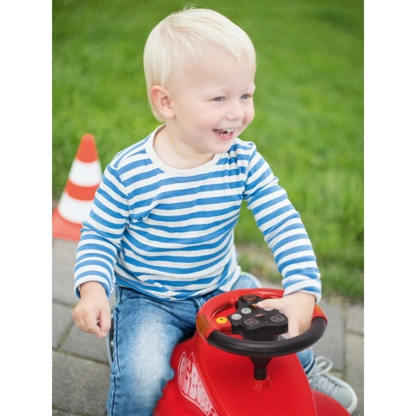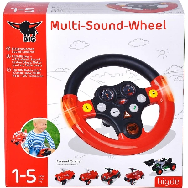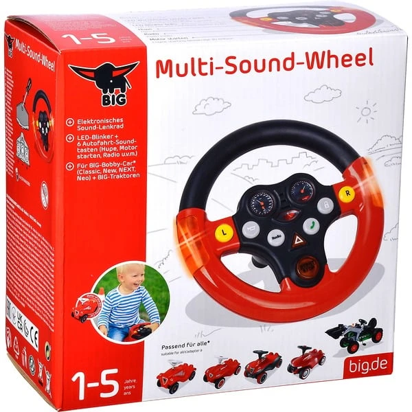 Wirklich einzigartig machen das BIG-Multi-Sound-Wheel die vielen kindgerechten Tasten mit Originalsounds der großen Fahrzeuge. Gestartet wird durch Drücken der On/Off-Taste. Sobald diese betätigt wird ertönt ein Anlassergeräusch. Nun wird entweder der Blinker auf der linken oder rechten Seite durch Knopfdruck betätigt und das bekannte Blinkgeräusch ertönt. Kurz über die linke oder rechte Schulter geguckt und wenn kein Auto kommt geht die Fahrt los. Für ein entspanntes Reisen sorgt die richtige Musik, die bei Druck der Radio-Taste ertönt. Das fröhliche BIG-Bobby-Car-Lied lädt zum Mitsingen ein.Art.-Nr.: 1195329