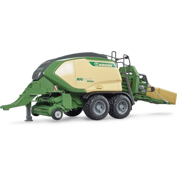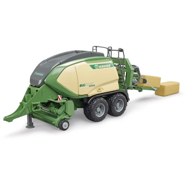 Die Firma Krone ist ein innovativer Hersteller von Erntemaschinen. Mit der neuen Baureihe der BigPack Großpackenpressen zeigt KRONE einmal mehr, dass auch nach mehr als 25 Jahren die Innovationskraft keinesfalls nachlässt. Die BigPack 1290 ist das Top Modell von KRONE und neu im landwirtschaftlichen Sortiment von BRUDER zu finden. Wie das Original, überzeugt auch das Spielzeug mit innovativen Funktionen. Der Pick-up ist abklappbar und wird über seitliche Räder angetrieben. Die Seitenklappen sind zu Öffnen und bieten Zugang zur detaillierten Mechanik. Die zwei Großballen können über die Mittelklappe eingelegt werden und die Presse transportiert, bei aktivem Pickup, diese automatisch zum Auswurf.