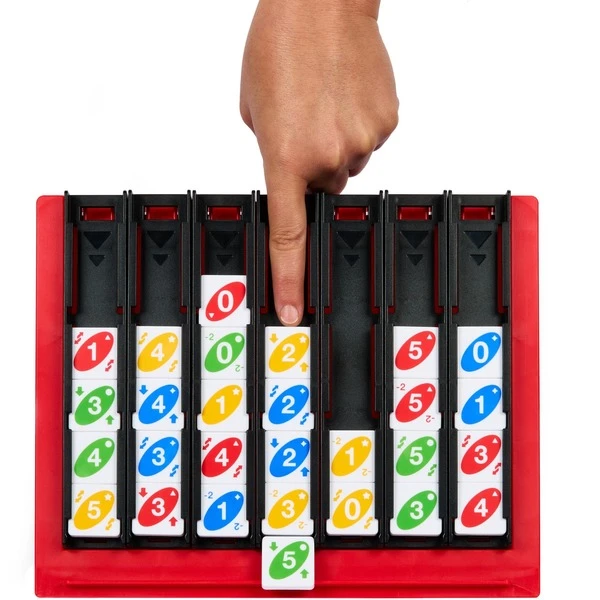Dieses Spiel kombiniert Elemente des klassischen UNO und von „Vier gewinnt“. Die Herausforderung besteht darin, eine Viererreihe zu bilden, während man zugleich versuchen muss, eine passende Farbe oder Zahl zu finden. Wer an der Reihe ist, legt seine Spielsteine in eines der 7 Fächer und versucht die Spielsteine so zu platzieren, dass sie vier in einer Reihe bilden. Die Spielsteine müssen dabei einen anderen Spielstein mit derselben Farbe oder Zahl berühren. Spezielle Aktionssteine verändern das Spiel und machen es komplizierter: Andere Spieler müssen nun mit weniger Spielsteinen auskommen, ein Spielstein wird aus einem Fach geschoben oder die Position von zwei Fächern wird vertauscht. Das Spiel arbeitet mit grafischen Symbolen, die es auch farbenblinden Spielern ermöglichen, die Farbe eines Spielsteins zu erkennen. Art.-Nr.: 1919808