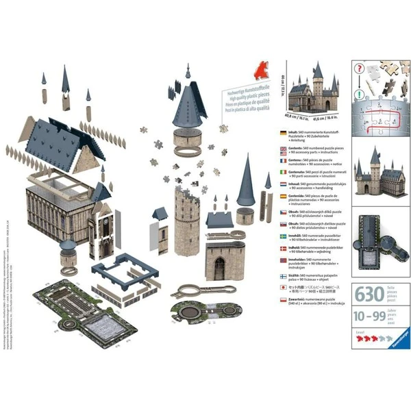 Zauberlehrlinge aufgepasst, jetzt geht es ab nach Hogwarts – und zwar ohne Umwege über Gleis Neundreiviertel, sondern vielmehr direkt von zuhause aus. Damit ist das Muggel-Leben vorbei! Denn jetzt heißt es endlich zur magischen Harry Potter Welt gehören und die hohe Zauberkunst an der berühmten Zauberschule studieren! Wer gerne in die faszinierende Welt von Harry Potter eintauchen möchte, ist mit diesem 3D Puzzle genau richtig. Denn hiermit lässt sich das Hogwarts Castle im Handumdrehen in die eigenen vier Wände zaubern. Dabei passen die 540 Kunststoff-Puzzleteile perfekt zusammen und ergeben am Ende ein formstabiles Gebäude, das von vielen Zubehörteilen ergänzt wird. Ein Muss für Harry Potter Fans – auch deshalb, weil das magische Bauwerk mit seinen Höhe von 44 cm eine beeindruckende Größendimension darstellt.Art.-Nr.: 1746893
