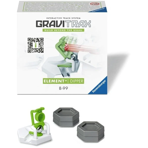 GraviTrax – das innovative Baukastensystem für anspruchsvolle Kugelbahnen. Aus einer Vielzahl an verschiedenen Bausteinen und Schienen lassen sich bei geschickter Nutzung der physikalischen Gesetze aktionsreiche Streckenverläufe planen, ausprobieren und realisieren. Mit den zahlreichen Erweiterungs-Sets wird das freie Bauen und Konstruieren des innovativen Bausystems GraviTrax jedes Mal aufs Neue noch interessanter und spannender! Mehr Möglichkeiten – mehr Spaß! Mit dem Element Dipper können Kugeln auf eine Ebene weiter unten befördert werden. Rollt eine Kugel in den Dipper, sorgt die Schwerkraft dafür, dass sie nach unten gelangt. Danach kann sie in eine von zwei händisch einstellbaren Richtungen weiterrollen. Dieses Element bringt, wenn es mit einem Starter-Set kombiniert oder in eine bereits aufgebaute GraviTrax-Welt integriert wird, ganz neuen Schwung und viele neue Möglichkeiten.Art.-Nr.: 1913161