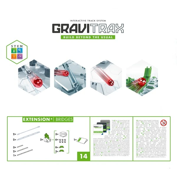 GraviTrax – das innovative Baukastensystem für anspruchsvolle Kugelbahnen. Aus einer Vielzahl an verschiedenen Bausteinen und Schienen lassen sich bei geschickter Nutzung der physikalischen Gesetze aktionsreiche Streckenverläufe planen, ausprobieren und realisieren. Mit den zahlreichen Erweiterungs-Sets wird das freie Bauen und Konstruieren des innovativen Bausystems GraviTrax jedes Mal aufs Neue noch interessanter und spannender! Mehr Möglichkeiten – mehr Spaß! Diese Erweiterung zu einem bereits bestehenden Starter-Set enthält Brückenteile zum Vergrößern der Bahn. Das bringt noch mehr Flexibilität in die GraviTrax-Welt!Art.-Nr.: 1913141
