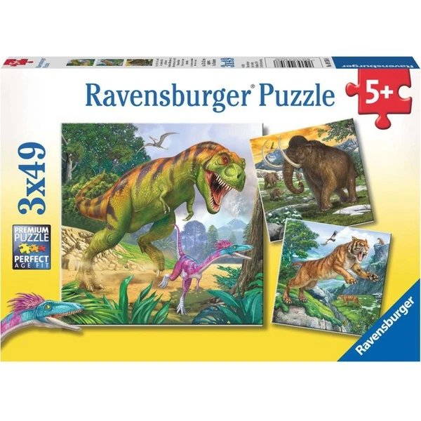 Ravensburger Kinderpuzzles überzeugen durch hochwertige Verarbeitung, altersgerechte Größen der Teile und tolle Motive. Je nach Anzahl der Teile sind sie auch schon für Kleinkinder ein spannender, langlebiger Puzzlespaß. Dieses Set für Kinder ab 5 Jahren enthält drei Puzzles mit jeweils 49 Teilen. Es zeigt drei beeindruckende Lebewesen der Uhrzeit: Einen Saurier, ein Mammut und einen Säbelzahntiger.Art.-Nr.: 100004696