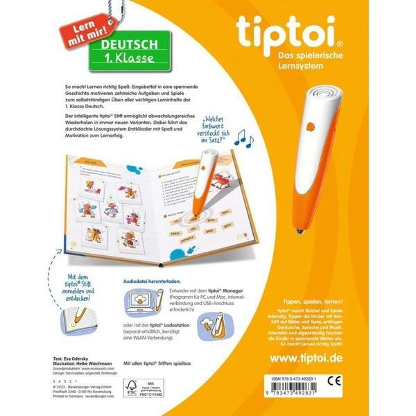 Mit den tiptoi-Büchern der Reihe Lern mit mir! lernen Kinder spielerisch die zentralen Lernthemen des Grundschulalters kennen. Dabei werden Deutsch-, Sachkunde und Mathematik-Inhalte der 1. Klasse vertieft. Die Inhalte werden kindgerecht und mit Bezug auf die Lehrpläne der Fächer vermittelt. Zahlreiche lustige Aufgaben mit Geräuschen und spannenden Geschichten erhalten den Spaß am Lernen mit motivierender Lösungskontrolle – das sorgt für nachhaltigen Lernerfolg. In diesem Buch zum Deutschunterricht der 1. Klasse erleben Leon und Luisa mit dem lustigen Monster Kritzel Abenteuer auf dem Spielplatz oder auf Großmutters Dachboden. Insgesamt sind über 50 Lernspiele und Aufgaben enthalten. Das Buch ist nach dem Lehrplan aufgebaut, aber die Aufgaben können auch einzeln bearbeitet werden. Art.-Nr.: 100019881