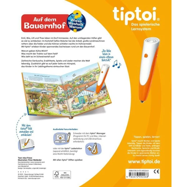 In diesem tiptoi-Buch geht es auf den Bauernhof: Für Emil, Mia, Lilli und Theo gibt es viel zu entdecken. Im Kuhstall helfen Roboter bei der Arbeit, auf dem Feld fahren Landmaschinen und die Hühner leben im Hühnermobil. Der Alltag in der Landwirtschaft ist vielfältig und kann hier mit Hilfe von tiptoi interaktiv entdeckt werde. Geräusche, Dialoge und Texte machen das Wissen lebendig. Art.-Nr.: 1876152