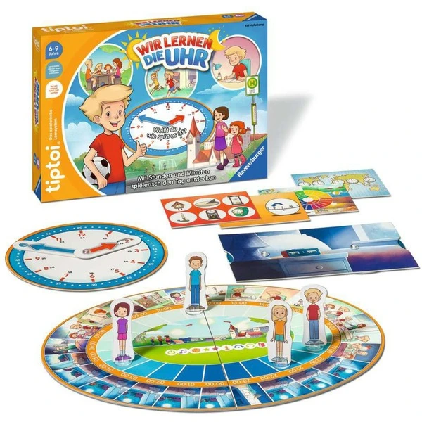 | Inhalt/Ausstattung | 1 beidseitig bespielbarer Spielplan, 1 analoge Uhr mit 2 Uhrzeigern aus Pappe, 1 digitale Uhr aus Pappe, 4 beidseitig bespielbare Themenkarten, 4 Spielfiguren mit Aufstellern | ||