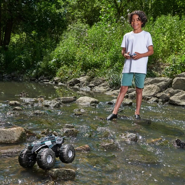 Haben spannende Batman-Abenteuer bisher hauptsächlich im Kinder- oder Wohnzimmer stattgefunden, so können kleine und große Batman-Fans diese jetzt nach draußen verlagern. Das einzigartige All-Terrain Batmobile im Maßstab 1:15 lässt sich per Fernsteuerung durch Gras, Sand, Matsch, Schnee und sogar Wasser steuern. Damit kann Batman seine Widersacher in ihrem natürlichen Umfeld verfolgen: King Shark im Wasser, Clayface im Matsch oder den Joker auf den Straßen von Gotham City (Figuren separat erhältlich). Batman (nicht im Lieferumfang enthalten) findet dabei in einer verschließbaren Kanzel im Fahrzeug platz. Aufgeladen wird das Amphibienfahrzeug per USB-Ladekabel und für die 2,4 GHz-Fernsteuerung benötigt der Pilot 2 AAA-Batterien (nicht enthalten). Entfernt sich das Fahrzeug an Land oder im Wasser zu weit von der Fernbedienung, setzt der integrierte Reichweitensensor ein und signalisiert dem Batman-Fan zurück in die Batcave zu kommen.Art.-Nr.: 1812425